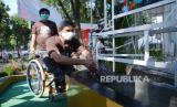Penyandang disabilitas mencoba fasilitas tempat cuci tangan ramah disabilitas saat peresmian Kampung Tangguh Nusantara (FOTO : Edi Yusuf/Republika)