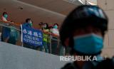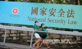 Wanita berjalan melewati spanduk promosi undang-undang keamanan nasional untuk Hong Kong, di Hong Kong, Selasa, 30 Juni 2020. Cina telah menyetujui undang-undang yang kontroversial yang akan memungkinkan pihak berwenang untuk menindak kegiatan subversif dan separatis di Hong Kong, memicu kekhawatiran. bahwa itu akan digunakan untuk mengekang suara oposisi di wilayah semi-otonom. (FOTO : AP / Kin Cheung)