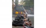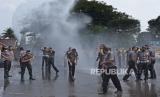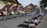 REPUBLIKA.CO.ID, SERANG -- Empatpulusatu personel polisi di bawah Polres Serang Kota disemprot air bertekanan tinggi dari mobil watercanon kendaraan taktis di Mapolres Serang, di Serang, Banten, Rabu (1/7/).