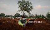Petugas menggali liang kubur di TPU Pondok Ranggon, Jakarta. (FOTO : Republika/Thoudy Badai)