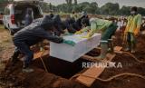 Petugas pemakaman menguburkan jenazah dengan protokol COVID-19 di TPU Pondok Ranggon, Jakarta. (FOTO : Republika/Thoudy Badai)