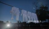 Pakaian alat pelindung diri petugas di gantung usai memakamkan jenazah di TPU Pondok Ranggon, Jakarta (FOTO : Republika/Thoudy Badai)