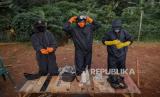 Petugas mengenakan alat pelindung diri saat proses pemakaman jenazah COVID-19 di TPU Pondok Ranggon, Jakarta. (FOTO : Republika/Thoudy Badai)