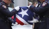 Petugas polisi melipat bendera negara bagian Mississipi dengan gambar bendera Konfederasi pada rangkaian penurunan bendera di depan gedung pemerintahan Capitol, Jackson, Mississipi. Bendera konfederasi dianggap bendera yang melambangkan rasisme di AS. Ini terkait sejarah panjang perbudakan dan Perang Sipil 1861-1865. (FOTO : AP)