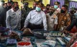 Ketua MPR Bambang Soesatyo (kedua kiri) memegang barang bukti narkoba yang akan dimusnahkan di Lapangan Promoter Ditlantas Polda Metro Jaya, Jakarta, Kamis (2/7/2020). Satuan Tugas Khusus Polri memusnahkan barang bukti narkoba berupa shabu sebanyak 1,2 ton, ekstasi sebanyak 35.000 butir, dan ganja 410 kilogram dari 25 orang tersangka terdiri dari enam orang warga negara asing (WNA) dan 19 orang WNI dalam kurun waktu Mei hingga Juni 2020. ANTARA FOTO/M Risyal Hidayat/nz (FOTO : ANTARA/M RISYAL HIDAYAT)