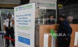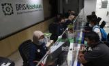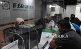 REPUBLIKA.CO.ID, JAKARTA -- Sekat pembatas dipasang di antara petugas dan peserta BPJS Kesehatan saat pelayanan di Kantor BPJS Kesehatan Cabang Jakarta Pusat, Kamis (2/7/2020).