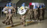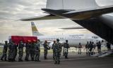 Prajurit TNI mengusung peti jenazah Pelda Anumerta Rama Wahyudi saat upacara pelepasan keberangkatan jenazah ke rumah duka di Pekanbaru, Riau, di Skadron Udara 17 Lanud Halim Perdanakusuma, Jakarta, Jumat (3/7/2020). Pelda Anumerta Rama Wahyudi merupakan salah satu anggota Satgas Kizi TNI Konga XX-Q/Monusco misi PBB yang gugur karena tertembak oleh kelompok bersenjata Allied Democratic Forces (ADF) saat bertugas mengirimkan logistik ke Temporary Operation Base (TOB) di wilayah Makisabo, Kongo, Afrika pada 22 Juni 2020. ANTARA FOTO/Aprillio Akbar/wsj. (FOTO : ANTARA FOTO/Aprillio Akbar)