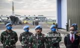 Panglima TNI Marsekal TNI Hadi Tjahjanto (tengah), Wakil Menteri Luar Negeri Mahendra Siregar (kanan), Kepala Staf Angkatan Udara (KASAU) Marsekal TNI Fadjar Prasetyo (kiri), Wakil Kepala Staf Angkatan Laut (Wakasal) Laksamana Madya TNI Mintoro (kedua kiri), dan Wakil Kepala Staf Angkatan Darat (Wakasad) Letjen TNI Moch Fachrudin (kedua kanan) memberikan keterangan pers usai mengikuti upacara pelepasan keberangkatan jenazah Pelda Anumerta Rama Wahyudi ke rumah duka di Pekanbaru, Riau, di Skadron Udara 17 Lanud Halim Perdanakusuma, Jakarta, Jumat (3/7/2020). Pelda Anumerta Rama Wahyudi merupakan salah satu anggota Satgas Kizi TNI Konga XX-Q/Monusco misi PBB yang gugur karena tertembak oleh kelompok bersenjata Allied Democratic Forces (ADF) saat bertugas mengirimkan logistik ke Temporary Operation Base (TOB) di wilayah Makisabo, Kongo, Afrika pada 22 Juni 2020. ANTARA FOTO/Aprillio Akbar/wsj. (FOTO : ANTARA FOTO/Aprillio Akbar)