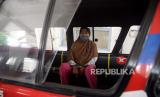 Penumpang berada dalam mikrotrans Jak Lingko yang telah menerapkan protkol kesehatan di terminal Pinang Ranti, Jakarta, Jumat (3/7). Setelah sempat dihentikan sementara, Mikrotrans Jak Lingko kembali beroprasi dengan menerapkan protokol kesehatan seperti pemasangan tanda jaga jarak, wajib masker guna menghindari masifnya penyebaran Covid-19.Prayogi/Republika. (FOTO : Republika/Prayogi)