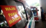 Stiker tanda wajib masker tertempel pada armada mikrotrans Jak Lingko yang telah menerapkan protkol kesehatan di terminal Pinang Ranti, Jakarta, Jumat (3/7). Setelah sempat dihentikan sementara, Mikrotrans Jak Lingko kembali beroprasi dengan menerapkan protokol kesehatan seperti pemasangan tanda jaga jarak, wajib masker guna menghindari masifnya penyebaran Covid-19.Prayogi/Republika. (FOTO : Republika/Prayogi)