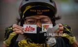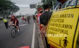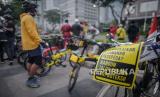 Komunitas yang tergabung dalam Bike To Work Indonesia menggelar kampanye edukasi tertib bersepeda di area FX Sudirman, Jalan Sudirman, Jakarta, Jumat (3/7). kampanye tersebut sebagai bentuk dukungan untuk menjaga jalur sepeda sekaligus mengedukasi sesama pesepeda agar tertib bersepeda. (FOTO : Republika/Thoudy Badai)