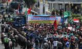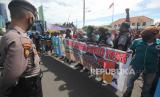 Sejumlah sopir truk berunjuk rasa di Surabaya, Jawa Timur, Jumat (3/7/2020). Para sopir truk logistik itu memprotes tes cepat (rapid test) COVID-19 berbayar yang diterapkan di pelabuhan penyeberangan Ketapang-Gilimanuk. ANTARA FOTO/Didik Suhartono/wsj. (FOTO : ANTARA FOTO/Didik Suhartono)