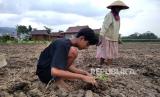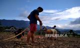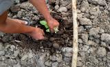 Petani menanam bibit tembakau di persawahan Desa Tuksongo, Magelang, Jawa Tengah, Jumat (3/7). Memasuki musim kemarau menjadi waktu untuk menanam tembakau. Daerah Tuksongo satu penghasil tembakau sawah berkualitas tinggi. Sehingga mayoritas perawatan berubah menjadi ladang tembakau saat kemarau. (FOTO : Wihdan Hidayat / Republika)