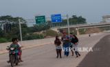 Pekerja melintas di proyek pembangunan jalan tol Serang - Panimbang di Desa Cikeusal, Kabupaten Serang, Banten, Jumat (3/7/2020). PT Wijaya Karya menjelaskan progres pembangunan jalan tol seksi I Serang sampai Cileles telah mencapai 71 persen dan ditargetkan mulai beroperasi tahun 2021 mendatang. (FOTO : ANTARA /Muhammad Bagus Khoirunas)