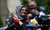 Hatice Cengiz tunangan jurnalis Saudi Jamal Kashoggi yang terbunuh, berbicara kepada anggota media di luar pengadilan di Istanbul, Jumat, 3 Juli 2020. (FOTO : AP Photo / Emrah Gurel)