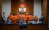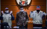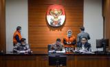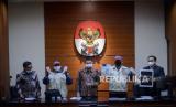 Wakil Ketua KPK Nawawi Pomolango (tengah), Deputi Penindakan KPK Karyoto (kiri), Juru Bicara KPK Ali Fikri (kanan) saat konferensi pers terkait kegiatan tangkap tangan kasus korupsi terhadap Bupati Kutai TImur di Gedung KPK, Jumat (3/7). KPK menetapkan tujuh tersangka dalam kegiatan tangkap tangan atas kasus korupsi dalam bentuk penerimaan hadiah atau janji terkait pekerjaan infrastruktur di lingkungan Kabupaten Kutai Timur diantaranya Bupati Kutai Timur dan istrinya sekaligus Ketua DPRD Kutai Timur serta, Kepala Bapenda dengan inisial (MUS), Kepala BPKAD (SUR), Kepala DInas PU (ASW), JA dan AM selaku rekanan dengan barang bukti uang tunai senilai Rp170 juta, Saldo tabungan Rp4,8 Miliar, dan sertifikat deposito sebesar Rp1,2 M. (FOTO : Republika/Thoudy Badai)