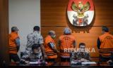 Wakil Ketua KPK Nawawi Pomolango (tengah), Deputi Penindakan KPK Karyoto (kiri), Juru Bicara KPK Ali Fikri (kanan) bersama petugas memperlihatkan barang bukti saat konferensi pers terkait kegiatan tangkap tangan kasus korupsi terhadap Bupati Kutai TImur di Gedung KPK, Jumat (3/7). KPK menetapkan tujuh tersangka dalam kegiatan tangkap tangan atas kasus korupsi dalam bentuk penerimaan hadiah atau janji terkait pekerjaan infrastruktur di lingkungan Kabupaten Kutai Timur diantaranya Bupati Kutai Timur dan istrinya sekaligus Ketua DPRD Kutai Timur serta, Kepala Bapenda dengan inisial (MUS), Kepala BPKAD (SUR), Kepala DInas PU (ASW), JA dan AM selaku rekanan dengan barang bukti uang tunai senilai Rp170 juta, Saldo tabungan Rp4,8 Miliar, dan sertifikat deposito sebesar Rp1,2 M. (FOTO : Republika/Thoudy Badai)