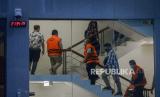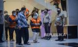 Tersangka Bupati Kutai Timur Ismunandar (ISM) (tengah) mengenakan rompi tahanan usai diperiksa di Gedung KPK, Jumat (3/7). KPK menetapkan tujuh tersangka dalam kegiatan tangkap tangan atas kasus korupsi dalam bentuk penerimaan hadiah atau janji terkait pekerjaan infrastruktur di lingkungan Kabupaten Kutai Timur diantaranya Bupati Kutai Timur dan istrinya sekaligus Ketua DPRD Kutai Timur serta, Kepala Bapenda dengan inisial (MUS), Kepala BPKAD (SUR), Kepala DInas PU (ASW), JA dan AM selaku rekanan dengan barang bukti uang tunai senilai Rp170 juta, Saldo tabungan Rp4,8 Miliar, dan sertifikat deposito sebesar Rp1,2 M. (FOTO : Republika/Thoudy Badai)