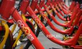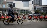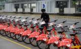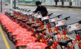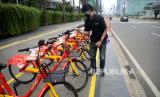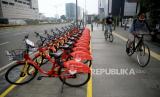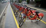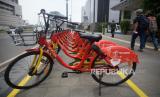 Sejumlah sepeda bike sharing Gowes terparkir di kawasan Bundaran HI, Jakarta, Sabtu (4/7). Gowes menawarkan layanan sewa sepeda berbasis aplikasi untuk masyarakat perkotaan yang hemat, mudah diakses dan ramah lingkungan, yang disewakan dengan tarif Rp 3.000 per 15 menit.Prayogi/Republika. (FOTO : Republika/Prayogi)