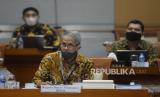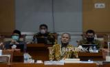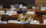 Kepala Badan Pelaksana Badan Pengelola Keuangan Haji (BPKH) Anggito Abimanyu saat mengikuti Rapat Dengar Pendapat (RDP) dengan Komisi VIII DPR di Kompleks Parlemen, Senayan, Jakarta, Senin (6/7). Rapat tersebut membahas mengenai evaluasi pengelolaan keuangan haji pasca pembatalan keberangkatan jamaah haji tahun 1441H/2020 M serta isu-isu aktual dan solusinya.Prayogi/Republika (FOTO : Republika/Prayogi)