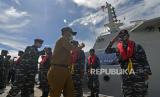 Wali Kota Palu Hidayat (kedua kiri) bersama Komandan Lanal Palu Kolonel Laut (P) Rahadian Rahmadi (kiri) menyambut personel Kapal Angkatan Laut (KAL) Talise setibanya di Dermaga Pangkalan TNI AL (Lanal) Palu di Palu, Sulawesi Tengah, Senin (6/7/2020). Kehadiran Kapal perang produksi dalam negeri yang dilengkapi dengan sejumlah sistem persenjataan itu akan menjalankan tugas dan fungsinya untuk memperkuat pertahanan dan mendukung Lanal Palu dalam patroli serta penegakan hukum di laut guna menjaga kedaulatan NKRI. ANTARA FOTO/Mohamad Hamzah/wsj. (FOTO : Antara/Mohamad Hamzah )