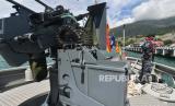 Personel Kapal Angkatan Laut (KAL) Talise berjaga di atas kapal saat bersandar di Dermaga Pangkalan TNI AL (Lanal) Palu di Palu, Sulawesi Tengah, Senin (6/7/2020). Kehadiran Kapal perang produksi dalam negeri yang dilengkapi dengan sejumlah sistem persenjataan itu akan menjalankan tugas dan fungsinya untuk memperkuat pertahanan dan mendukung Lanal Palu dalam patroli serta penegakan hukum di laut guna menjaga kedaulatan NKRI. ANTARA FOTO/Mohamad Hamzah/wsj. (FOTO : Antara/Mohamad Hamzah )