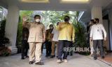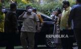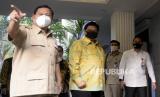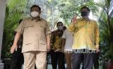 REPUBLIKA.CO.ID, JAKARTA -- Ketua Umum Partai Gerindra Prabowo Subianto bersama Ketua Umum Partai Golkar Airlangga Hartarto sebelum menggelar pertemuan di kediaman Kertanegara, Jakarta, Senin (6/7). Pertemuan ini yang merupakan Kunjungan balasanan Airlangga kepada Prabowo dan dilakukan secara tertutup.