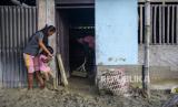 Warga membersihkan rumahnya dari lumpur yang menggenanginya di Dusun II, Desa Poi, Kabupaten Sigi, Sulawesi Tengah, Senin (6/7/2020). Selain lumpur, banjir yang terjadi pada Minggu (5/7/2020) sore akibat hujan deras itu juga membawa material bebatuan dan kayu. Meskipun tidak menimbulkan korban jiwa, namun banjir ketiga kalinya yang terjadi dalam sepekan terakhir di desa itu merusak sejumlah rumah warga. ANTARAFOTO/Basri Marzuki/hp. (FOTO : BASRI MARZUKI/ANTARAFOTO)