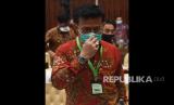 REPUBLIKA.CO.ID, JAKARTA -- Menteri Pertanian Syahrul Yasin Limpo mengenakan kalung bertuliskan anti virus corona saat rapat kerja dengan Komisi IV DPR di Kompleks Parlemen, Senayan, Jakarta, Selasa (7/7/2020).