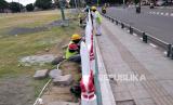 Pekerja mengecat pagar besi di tepi Alun Alun Utara Keraton Yogyakarta, Selasa (7/7). Alun Alun Utara Yogyakarta direstorasi dengan memasang pagar besi di bagian tepinya. Pemasangan ini menggunakan dana keistimewaan (Danais) dengan anggaran mencapai Rp 2,3 miliar. Hal ini bertujuan untuk mengembalikan bentuk alun alun sesuai zaman dahulu dan ditargetkan selesai pada Juli mendatang. (FOTO : Wihdan Hidayat / Republika)