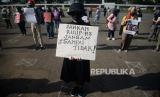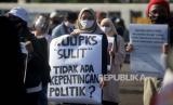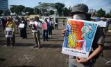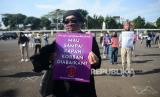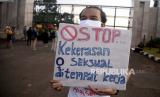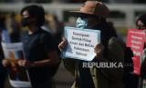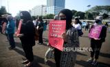 Sejumlah aktivis yang tegabung dalam GERAK Perempuan melakukan aksi di depan Gedung Parlemen, Senayan, Jakarta, Selasa (7/7). Aksi tersebut sebagai sikap penolakan atas dikeluarkannya RUU Penghapusan Kekerasan Seksual (RUU PKS) dari Program Legislasi Nasional (Prolegnas) Prioritas 2020 sekaligus ajakan solidaritas kepada masyarakat yang anti kekerasan seksual dan mendukung pengesahan RUU PKS.Prayogi/Republika. (FOTO : Prayogi/Republika)