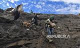 Warga berebut sesaji yang dilempar oleh masyarakat Suku Tengger ke kawah Gunung Bromo dalam rangka perayaan Yadnya Kasada, Probolinggo, Jawa Timur, Selasa (7/7/2020). Perayaan Yadnya Kasada merupakan bentuk ungkapan syukur dan penghormatan kepada leluhur masyarakat Suku Tengger dengan cara melarung sesaji berupa hasil bumi dan ternak ke kawah Gunung Bromo. (FOTO : Antara/Zabur Karuru)