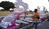 Pemilik becak hias menyiapkan kendaraan untuk disewakan saat sore di Alun Alun Selatan Yogyakarta, Selasa (7/7). Aktivitas di Alun Alun Selatan mulai hidup kembali, warga mulai berolahraga atau menghabiskan sore hari bersama anak anak. Namun, bagi pedagang dan penyewaan becak hias dibatasi mulai dari pukul 4 sore hingga 8 malam. (FOTO : Wihdan Hidayat / Republika)