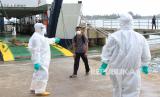 Sementara itu petugas medis menjemput salah seorang pekerja kapal KMP Teluk Sinabang yang diduga reaktif COVID-19, di Pelabuhan penyeberangan Meulaboh-Sinabang Desa Gampong Teungoh, Samatiga, Aceh Barat, Aceh.