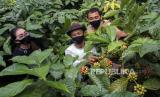 Petani didampingi penyuluh pertanian dari pemerintah setempat dan salah satu pengusaha kopi memanen biji kopi jenis robusta di lahan kopi milik warga di Desa Surjo, Bawang, Kabupaten Batang, Jawa Tengah, Selasa (7/6/2020). Pemerintah setempat dan pengusaha kopi Kingkaf memberikan pendampingan edukasi petani lokal dalam peningkatan kualitas kopi mulai dari cara menanam kopi hingga pasca panen dengan benar untuk meningkatkan daya jual kopi dan kesejahteraan petani lokal, dengan melakukan peremajaan pohon untuk menambah luas tanam batang kopi. (FOTO : ANTARA/Harviyan Perdana Putra)