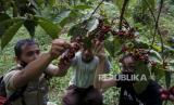 REPUBLIKA.CO.ID, BATANG -- Petani didampingi penyuluh pertanian dari pemerintah setempat dan salah satu pengusaha kopi memanen biji kopi jenis robusta di lahan kopi milik warga di Desa Surjo, Bawang, Kabupaten Batang, Jawa Tengah, Selasa (7/6/2020).