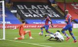Pemain Crystal Palace Christian Benteke mencetak gol kedua timnya pada pertandingan sepak bola Liga Primer Inggris antara Crystal Palace dan Chelsea di Selhurst Park, di London, Inggris, Rabu (8/7) dini hari WIB. (FOTO : Justin Setterfield / Pool via AP)
