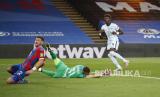 Christian Benteke (kiri kedua) mencetak gol kedua timnya pada pertandingan sepak bola Liga Utama Inggris antara Crystal Palace dan Chelsea di Selhurst Park, di London, Inggris, Rabu (8/7) dini hari WIB. (FOTO : Justin Tallis / Pool via AP)