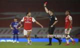 Wasit Chris Kavangah memberikan kartu merah untuk pemain Arsenal Eddie Nketiah pada pertandingan sepak bola Liga Premier Inggris antara Arsenal dan Leicester di Stadion Emirates di London, Inggris, Rabu(8/7) dini hari. (FOTO : AP / Adam Davy, Pool)