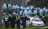 Petugas kepolisian Victoria dan petugas kesehatan berkumpul di luar sebuah menara perumahan umum di Melbourne Utara, Australia, Rabu (8/7). (FOTO : EPA-EFE / ROSS JAMES)