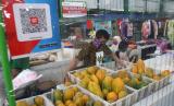 Penjual menata barang dagangannya yang pembayarannya menggunakan sistem daring berkode Quick Respons (QR) di Pasar Tangguh, Oro-oro Dowo, Malang, Jawa Timur, Rabu (8/7/2020). Selain mewajibkan para pedagang memasang plastik pengaman, Dinas Pasar setempat juga memberlakukan sistem pembayaran berkode QR guna mencegah penyebaran COVID-19. (FOTO : ANTARA /Ari Bowo Sucipto)