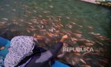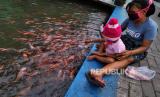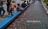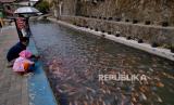 REPUBLIKA.CO.ID, YOGYAKARTA -- Warga bersama anak-anak memberi makan ikan nila di saluran irigasi Bendung Lepen, Taman Kali Gajahwong, Yogyakarta, Kamis (9/7).