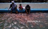 Warga bersama anak-anak memberi makan ikan nila di saluran irigasi Bendung Lepen, Taman Kali Gajahwong, Yogyakarta, Kamis (9/7). Sejak 2019 saluran irigasi dijadikan tempat budidaya ikan nila oleh warga. Sepanjang 100 meter bagian saluran irigasi diisi 3,4 kwintal ikan nila. Dengan estimasi pendapatan mencapai Rp 20 juta hingga Rp 25 juta serial panen. Selain itu, warga juga menjadikan ini sebagai wisata edukasi untuk anak-anak. (FOTO : Wihdan Hidayat / Republika)