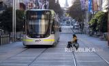 Seseorang di kursi roda menyeberangi trem di Melbourne, Australia, Kamis (9/7/2020). Wilayah metropolitan Melbourne dilockdown dalam upaya memperlambat penyebaran virus corona. (FOTO : EPA-EFE / LUIS ASCUI )