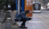 Seseorang mengenakan headphone duduk di bangku di Melbourne, Australia, Kamis (9/7/2020). Wilayah metropolitan Melbourne dilockdown dalam upaya memperlambat penyebaran virus corona. (FOTO : EPA-EFE / LUIS ASCUI )