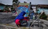 Anak-anak mencuci tangan sebelum membaca buku di layanan perpustakaan keliling PUSPITA dari Perpustakaan Kota Yogyakarta di Ngampilan, Yogyakarta, Kamis (9/7). Sejak Senin (6/7) layanan perpustakaan keliling untuk anak-anak PUSPITA beroperasi kembali imbas pandemi Covid19. Sebanyak 8 kendaraan mengunjungi kembali warga, tetapi dalam sehari hanya dua lokasi dengan waktu dua jam. (FOTO : Wihdan Hidayat / Republika)