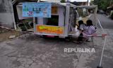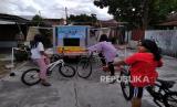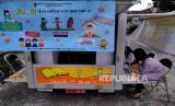Anak-anak mendatangi layanan perpustakaan keliling PUSPITA dari Perpustakaan Kota Yogyakarta di Ngampilan, Yogyakarta, Kamis (9/7). Sejak Senin (6/7) layanan perpustakaan keliling untuk anak-anak PUSPITA beroperasi kembali imbas pandemi Covid19. Sebanyak 8 kendaraan mengunjungi kembali warga, tetapi dalam sehari hanya dua lokasi dengan waktu dua jam. (FOTO : Wihdan Hidayat / Republika)