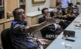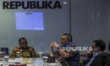 Wakil Ketua Umum Partai Nasdem Ahmad M. Ali (kiri) dan Ketua Komisi VII DPR RI dari Fraksi Partai Nasdem Sugeng Suparwoto (kedua kiri) memberikan paparan saat mengunjungi kantor Republika di Jakarta, Kamis (9/7). Kunjungan itu sebagai ajang silaturahim dan mendiskusikan dinamika politik serta kondisi bangsa dengan isu-isu terkini. Republika/Putra M. Akbar (FOTO : Republika/Putra M. Akbar)