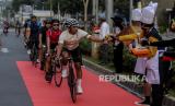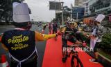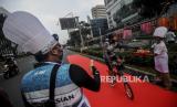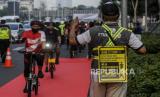 REPUBLIKA.CO.ID, JAKARTA -- Sejumlah anggota Komunitas Bike To Work Indonesia membagikan makanan kepada pesepeda di kawasan Sudirman, Jakarta, Jumat (10/7).