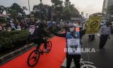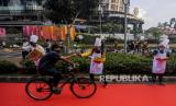 Sejumlah anggota Komunitas Bike To Work Indonesia menunjukan poster saat sosialisasi di kawasan Sudirman, Jakarta, Jumat (10/7). Aksi simpatik bertajuk Yang Bersepeda Yang Istimewa itu untuk mengedukasi pengguna jalan untuk tertib berlalu lintas serta membagikan makanan dan minuman gratis untuk pesepeda yang melintasi kawasan tersebut. Republika/Putra M. Akbar (FOTO : Republika/Putra M. Akbar)